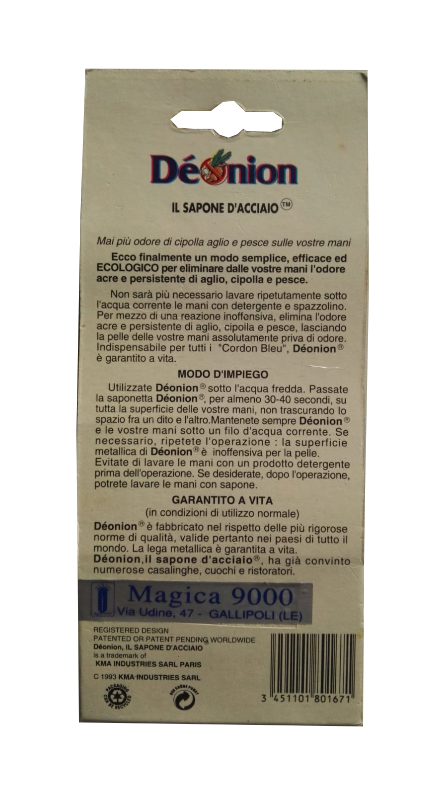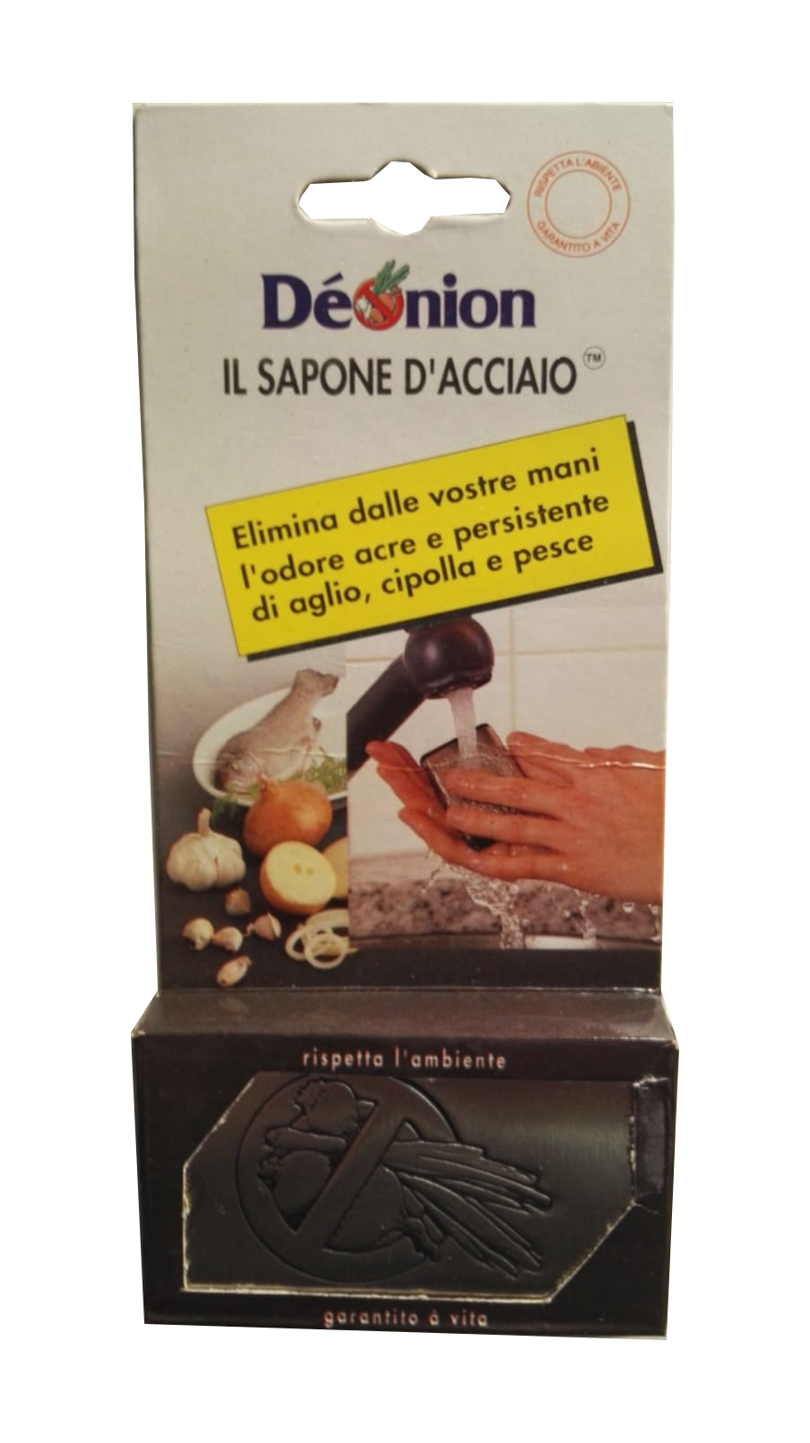 La saponetta in acciaio Déonion è il modo semplice, efficace ed ECOLOGICO per eliminare dalle vostre mani l’odore acre e persistente di aglio, cipolla e pesce.